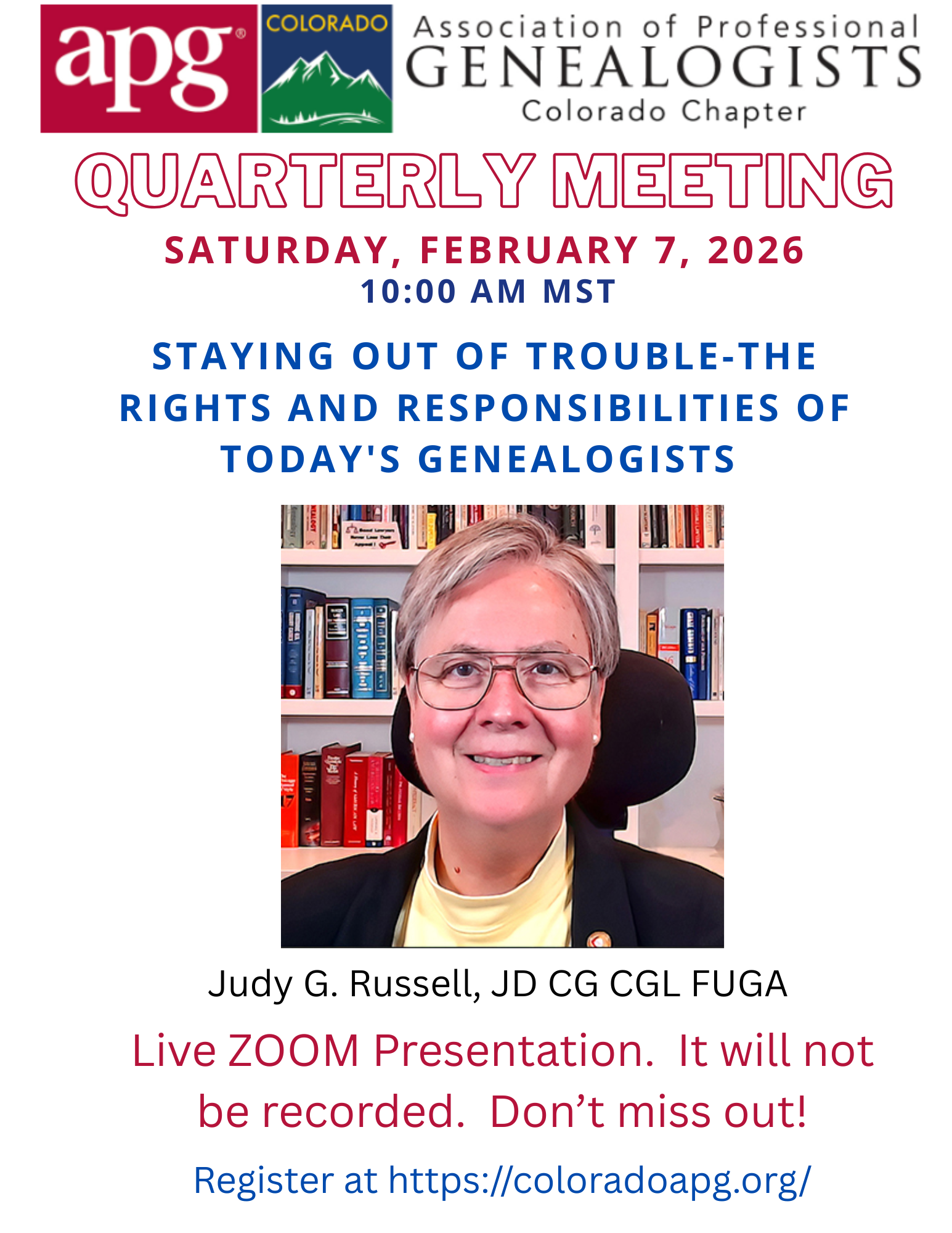 Presentation: Staying Out of Trouble-The Rights and Responsibilities of Today’s Genealogists, Judy G. Russell, JD CG CGL FUGA